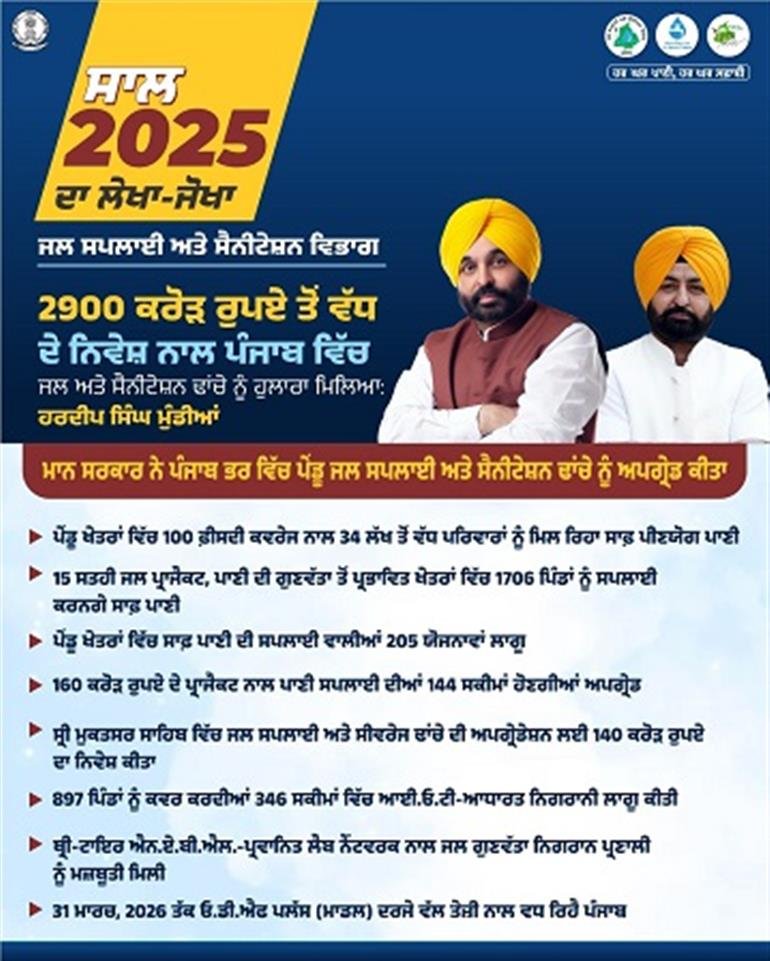 ਪੰਜਾਬ ਦੇ ਜਲ ਸਪਲਾਈ ਅਤੇ ਸੈਨੀਟੇਸ਼ਨ ਮੰਤਰੀ ਹਰਦੀਪ ਸਿੰਘ ਮੁੰਡੀਆਂ ਨੇ ਦੱਸਿਆ ਕਿ ਮੁੱਖ ਮੰਤਰੀ ਭਗਵੰਤ ਸਿੰਘ ਮਾਨ ਦੀ ਅਗਵਾਈ ਵਾਲੀ ਸਰਕਾਰ ਨੇ ਪੰਜਾਬ ਭਰ ਵਿੱਚ ਜਲ ਸਪਲਾਈ ਅਤੇ ਸੈਨੀਟੇਸ਼ਨ ਬੁਨਿਆਦੀ ਢਾਂਚੇ ਨੂੰ ਮਜ਼ਬੂਤ ਕਰਨ ਲਈ 2,900 ਕਰੋੜ ਰੁਪਏ ਤੋਂ ਵੱਧ ਦਾ ਨਿਵੇਸ਼ ਕੀਤਾ ਹੈ। ਉਨ੍ਹਾਂ ਕਿਹਾ ਕਿ ਇਸ ਨਿਰੰਤਰ ਵਿੱਤੀ ਧੱਕੇ ਨੇ ਪੇਂਡੂ ਅਤੇ ਅਰਧ-ਸ਼ਹਿਰੀ ਖੇਤਰਾਂ ਵਿੱਚ ਰੋਜ਼ਾਨਾ ਜੀਵਨ ਵਿੱਚ ਸੁਧਾਰ ਦੇ ਸਿੱਧੇ ਨਤੀਜੇ ਦੇ ਨਾਲ ਵੱਡੇ ਪ੍ਰੋਜੈਕਟਾਂ ਦੇ ਮੁਕੰਮਲ ਹੋਣ, ਤਕਨਾਲੋਜੀ ਨੂੰ ਅਪਣਾਉਣ ਅਤੇ ਪਾਣੀ ਦੀ ਗੁਣਵੱਤਾ ਅਤੇ ਸੈਨੀਟੇਸ਼ਨ ਪ੍ਰਣਾਲੀਆਂ ਨੂੰ ਮਜ਼ਬੂਤ ਕਰਨ ਵਿੱਚ ਤੇਜ਼ੀ ਲਿਆ ਹੈ। ਉਨ੍ਹਾਂ ਕਿਹਾ ਕਿ 100 ਫੀਸਦੀ ਕਵਰੇਜ ਨਾਲ ਸੂਬੇ ਵਿੱਚ ਇਸ ਸਮੇਂ 34 ਲੱਖ ਤੋਂ ਵੱਧ ਪਰਿਵਾਰ ਸੁਰੱਖਿਅਤ ਅਤੇ ਪੀਣ ਯੋਗ ਪਾਣੀ ਪ੍ਰਾਪਤ ਕਰ ਰਹੇ ਹਨ। ਮੰਤਰੀ ਨੇ ਦੱਸਿਆ ਕਿ ਵਿੱਤੀ ਸਾਲ 2025-26 ਲਈ ਰਾਜ ਵਿੱਚ ਪੇਂਡੂ ਵਿਕਾਸ ਲਈ ਗ੍ਰਾਮੀਣ ਸੈਨੀਟੇਸ਼ਨ ਸੈਕਟਰ ਵਿੱਚ 2,190.80 ਕਰੋੜ ਰੁਪਏ ਦੀ ਸਾਲਾਨਾ ਲਾਗੂ ਯੋਜਨਾ ਨੂੰ ਪ੍ਰਵਾਨਗੀ ਦਿੱਤੀ ਗਈ ਹੈ।